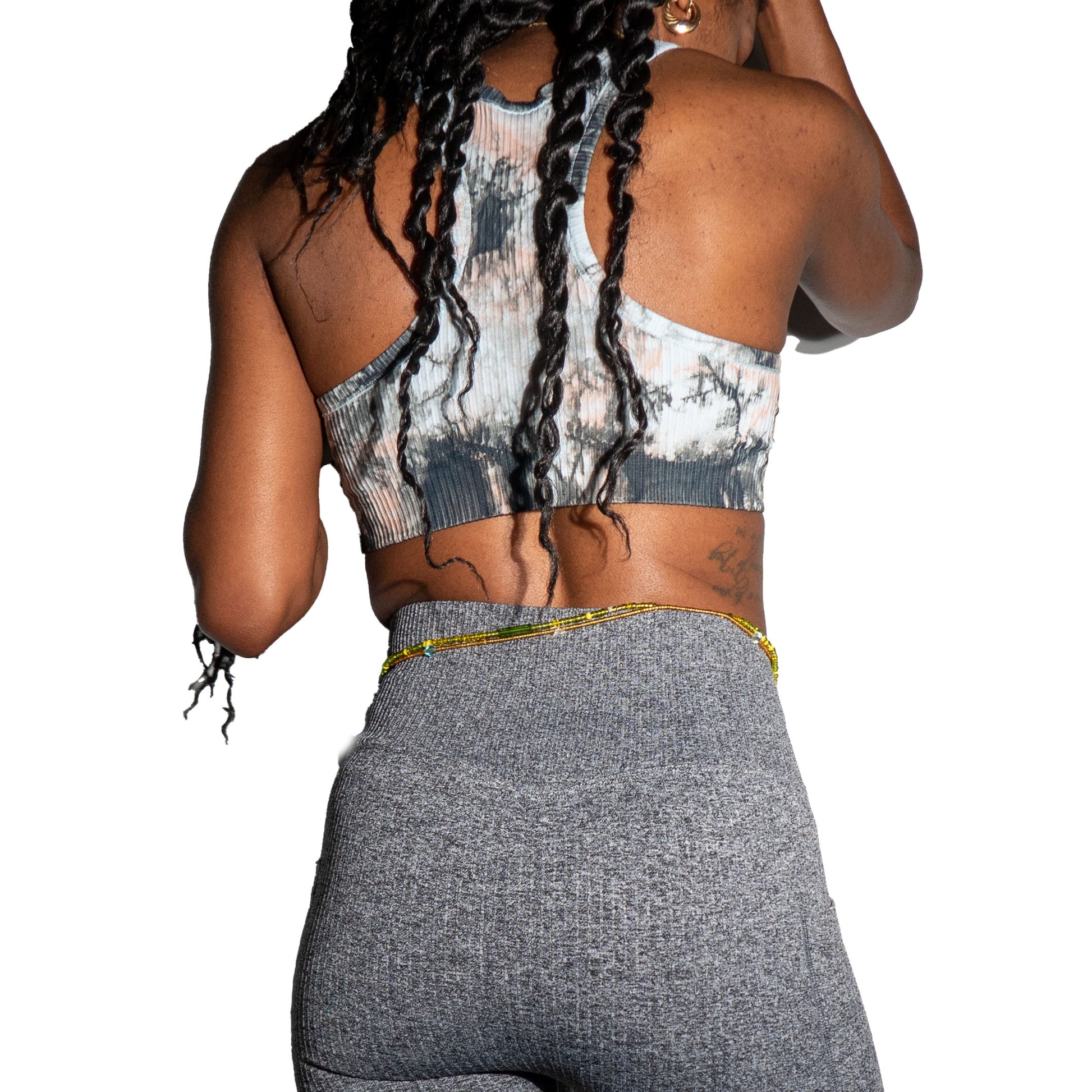 Comfort is key... Abby is a seamless racerback sports bra with removable cups. It has a tie-dye pattern and ribbed texture.