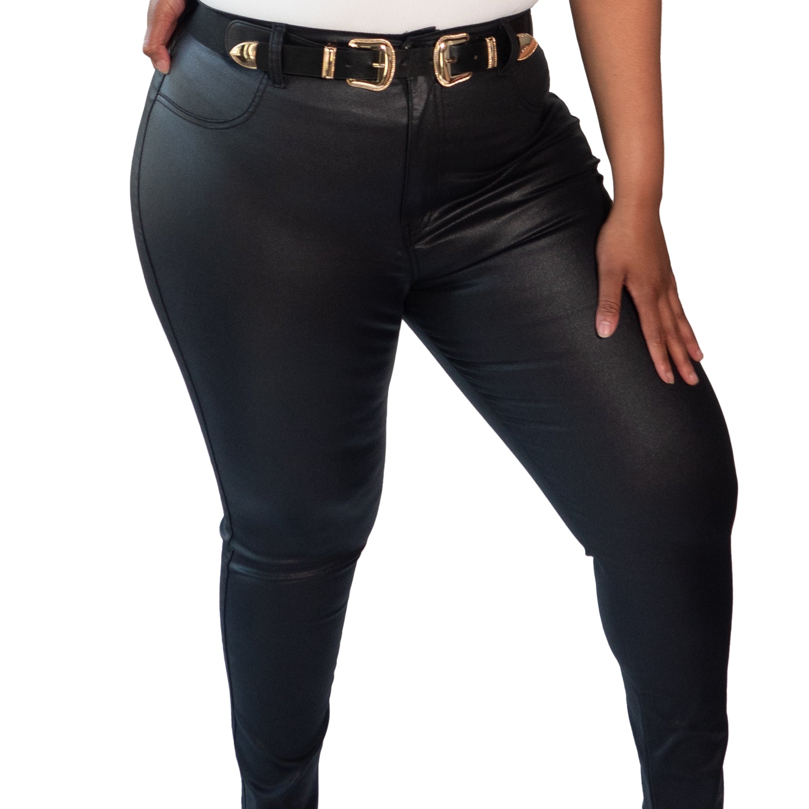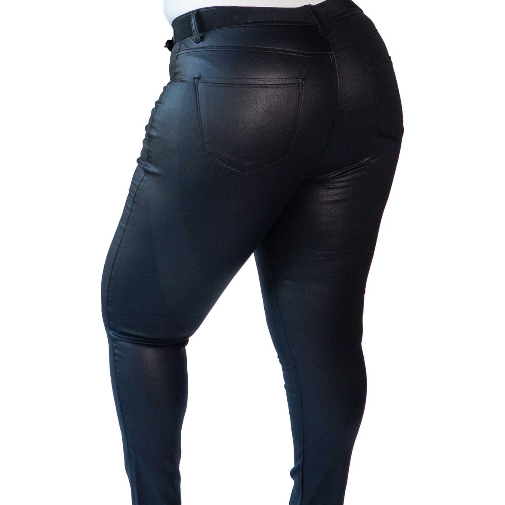 Edgy and Chic! Angela is a faux-leather skinny pant with a zip- fly closure. Although the front pockets are not functional, we’ve got you covered with 2 back pockets. If you think you’re in-between sizes, go up one.