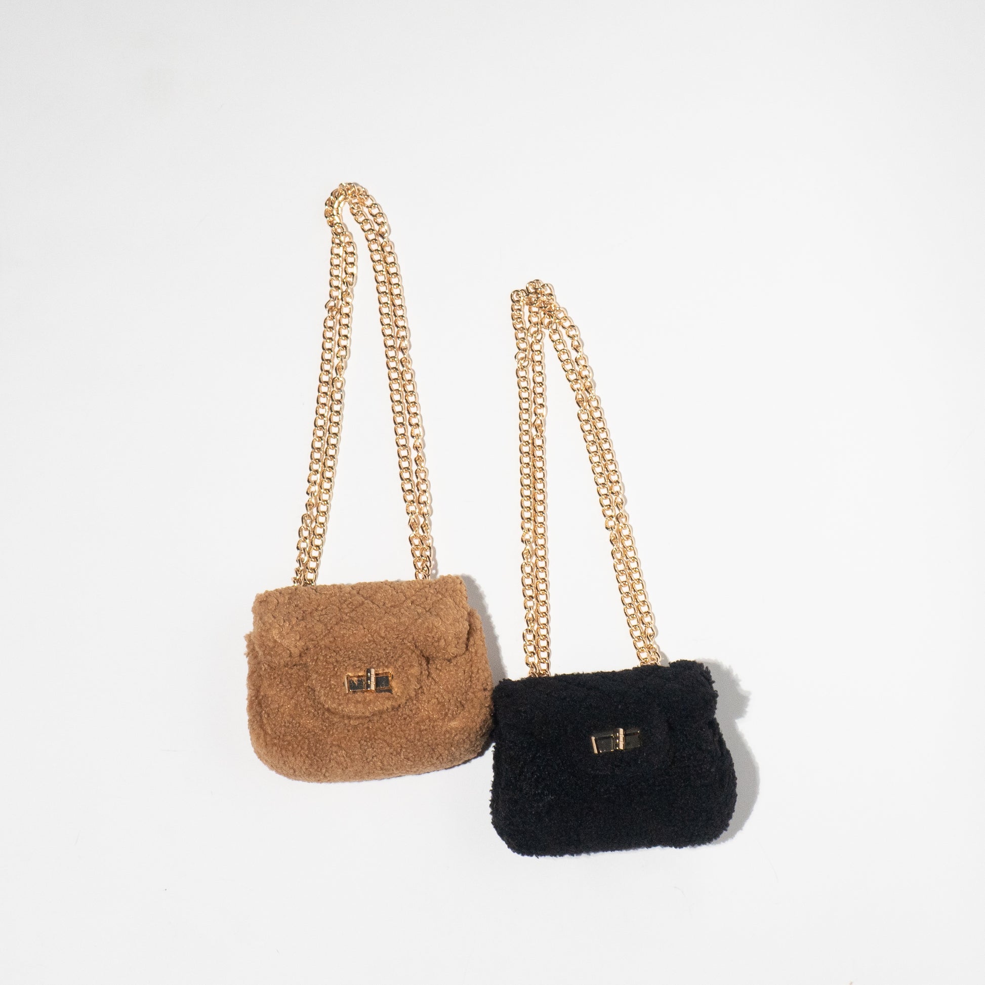 So cute and fluffy! Carolyn is a quilted sherpa mini bag with gold cross-body chain. For extra fun, Carolyn can also be worn as a shoulder bag.