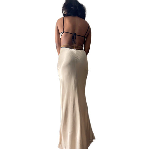 Cedar City Maxi Dress is a slinky V-neck style with a keyhole cut-out detail and contrast binding that carries through straps to tie-back. The bias-cut maxi is finished with a rolled hem, and an adjustable knotted strap which can be loosened and tied at desired length. True to size, but narrow in the waist. Select your normal size.