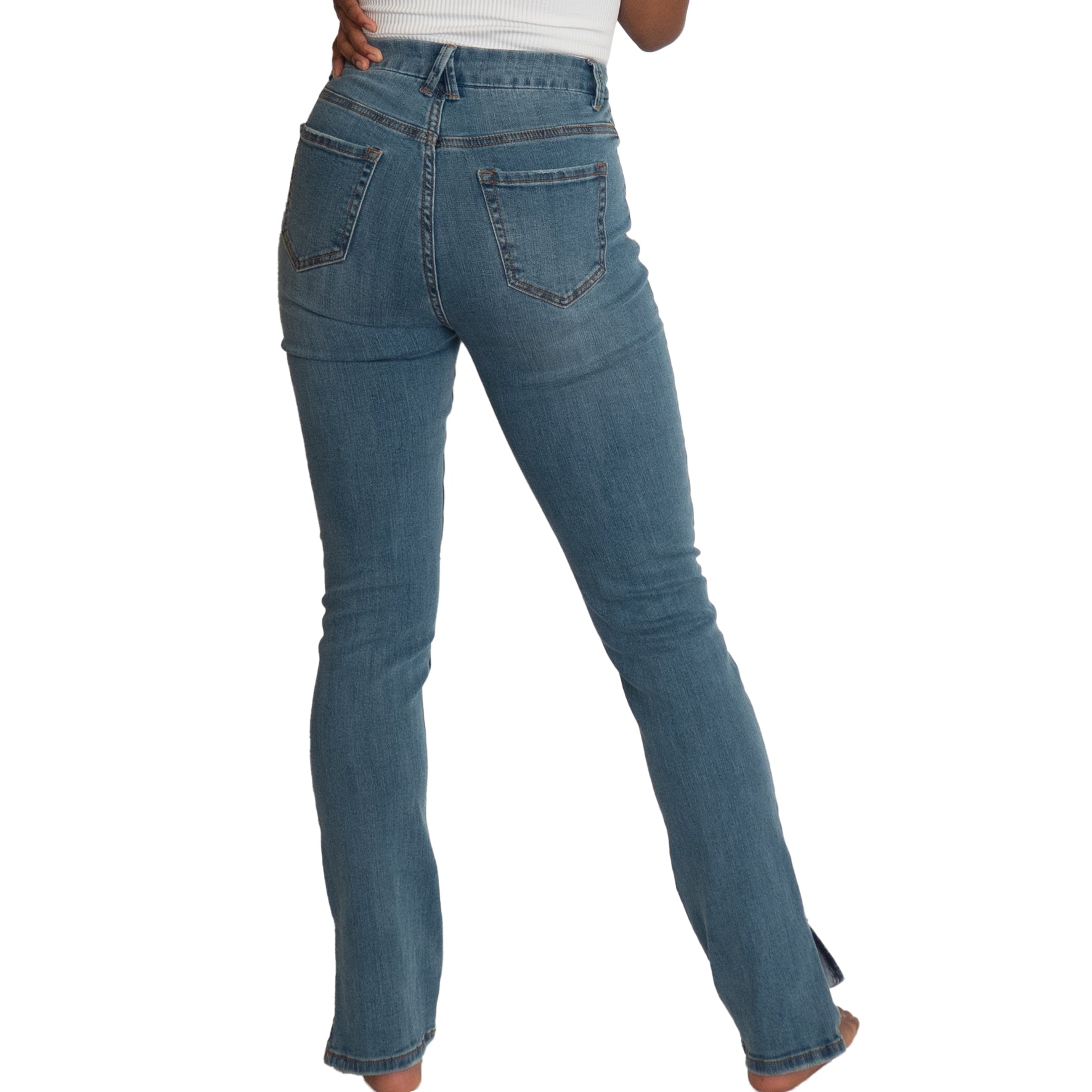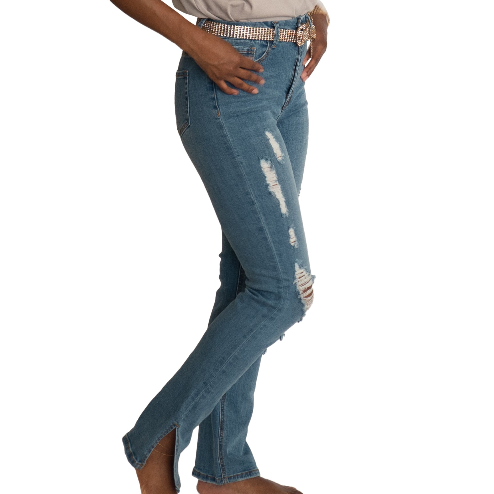 Dominique is high-rise straight leg stretch jean with distressed detailing on the front and ankle slit openings. She also has five pockets to hold all of your things. As well as a button and zipper closure.