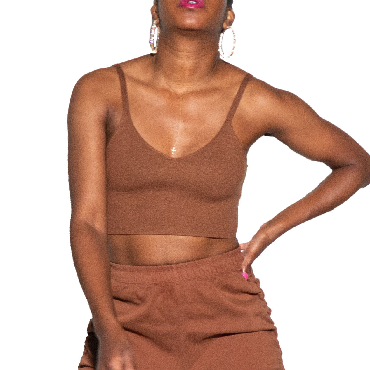 Cozy chic at its finest. Jaffe is a warm brown knit crop top that is meant to hug your curves. Wear it alone or layer it with am oversized shirt or jacket.