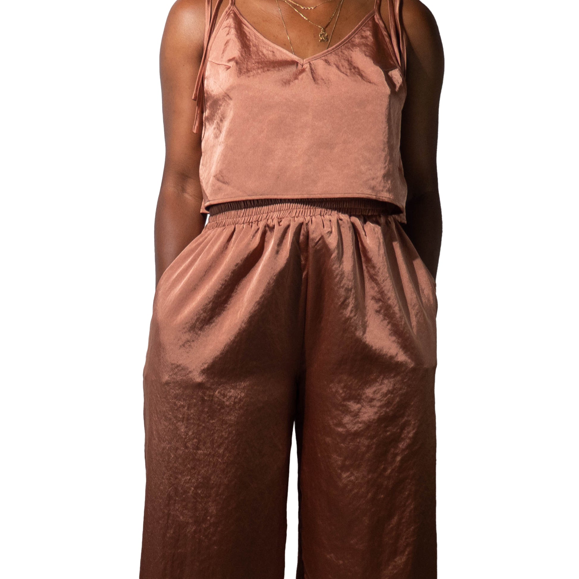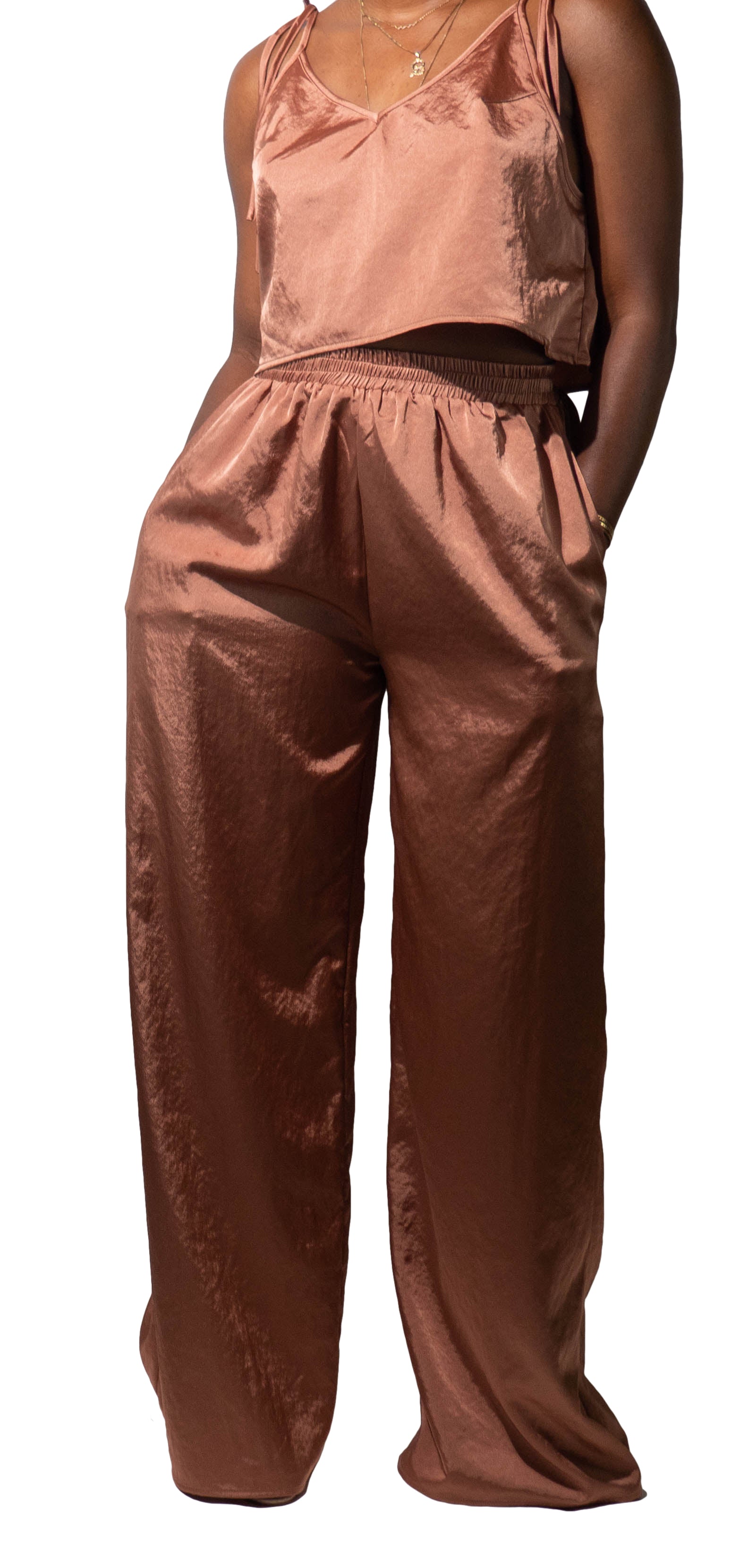 A dreamy duo in the color rust. This satin two-piece features an oversized crop top with adjustable tie straps and a long pull on palazzo pant with a full elastic waistband. The pants have two side pockets.