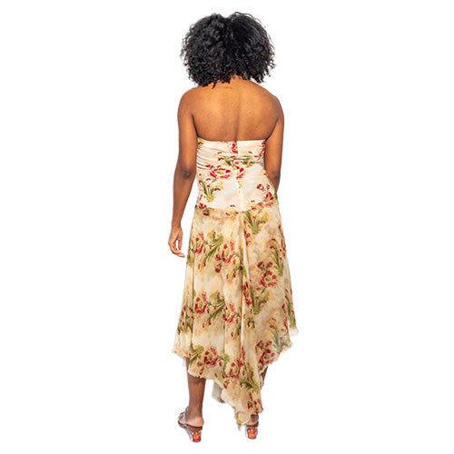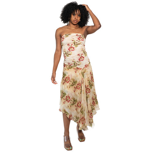 Monette Asym strapless maxi dress, genieve print is vintage inspired, viscose jersey body with contrast viscose crinkle georgette raw cut hanky hemline.