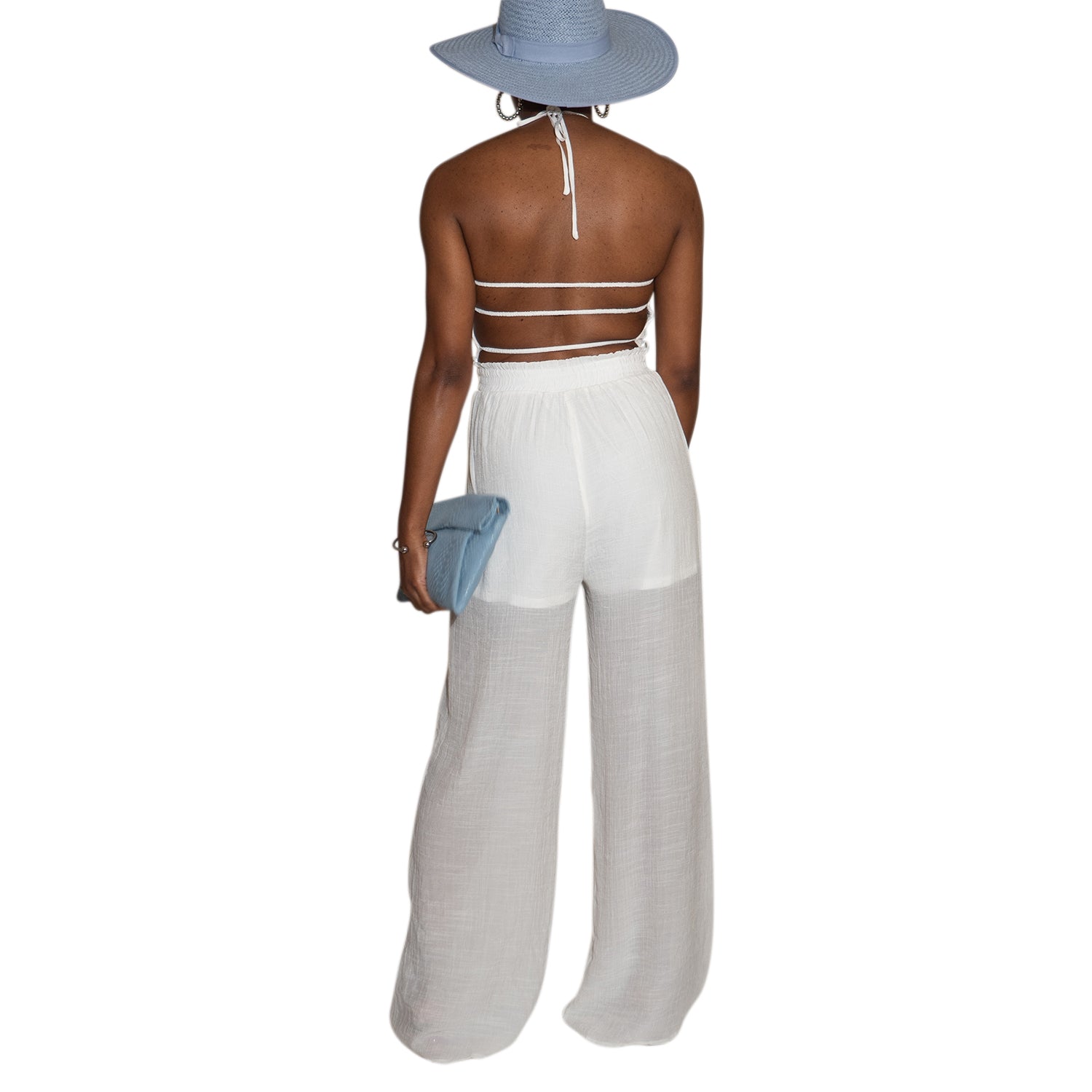 So fresh and so clean. Off-white Jumpsuit with a smocked top and halter tie straps. Open back with 3 elastic bands and elastic waist band. Lightweight fabric and short length lining under the pant leg.Garment length 59” and inseam 31”