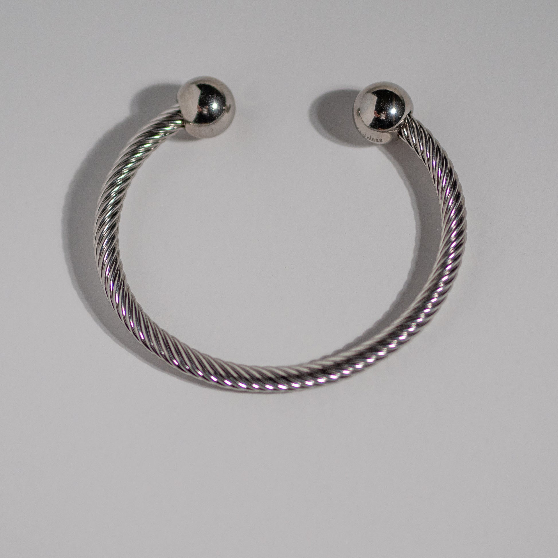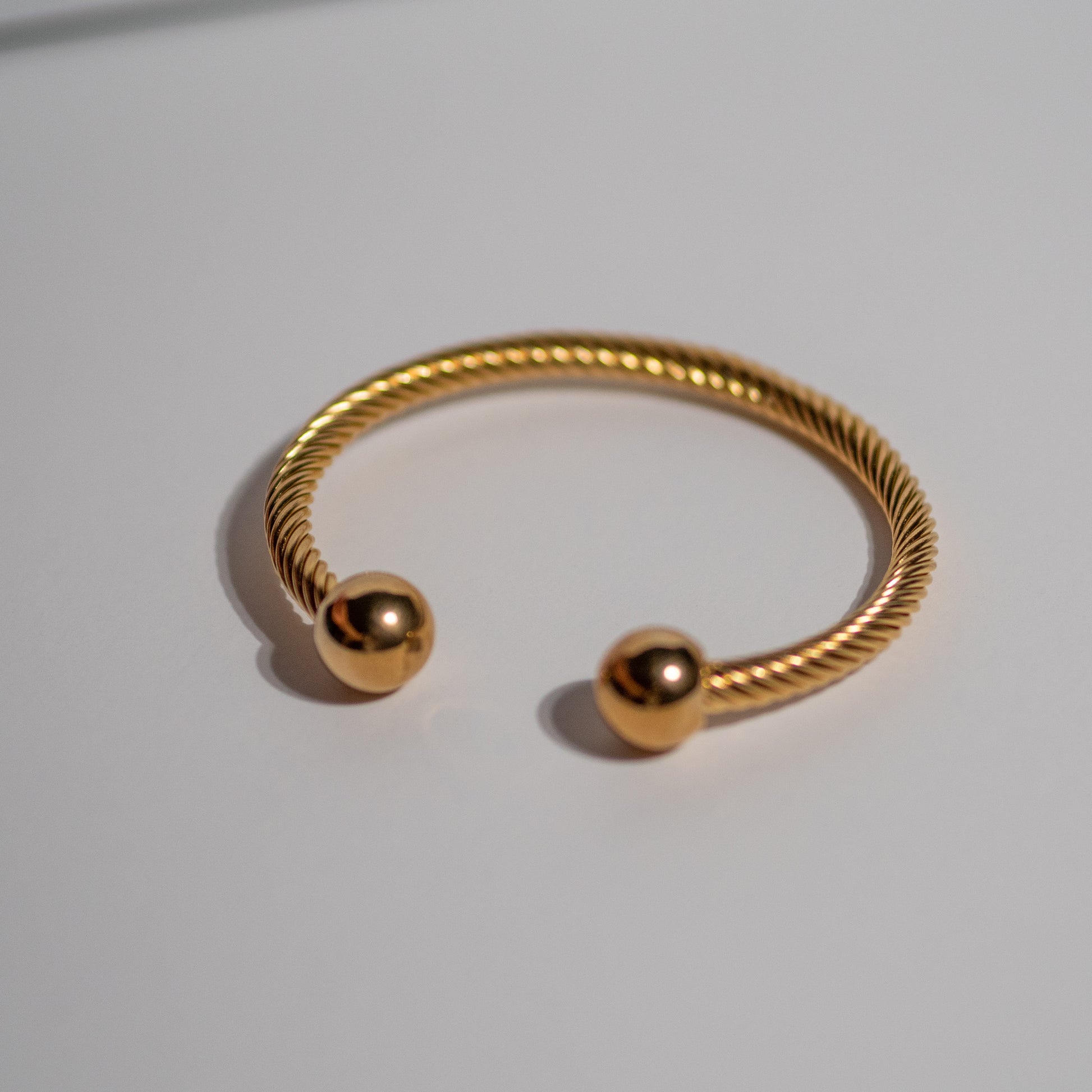 Quincy is a stainless steel rope bangle with ball ends. Open cuff detail in gold and silver.