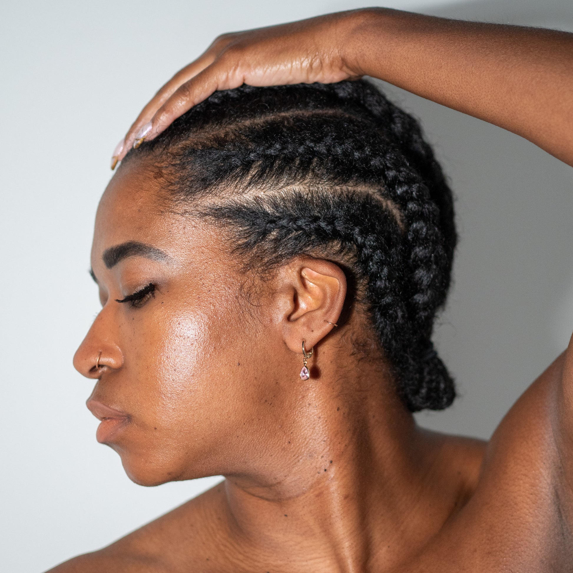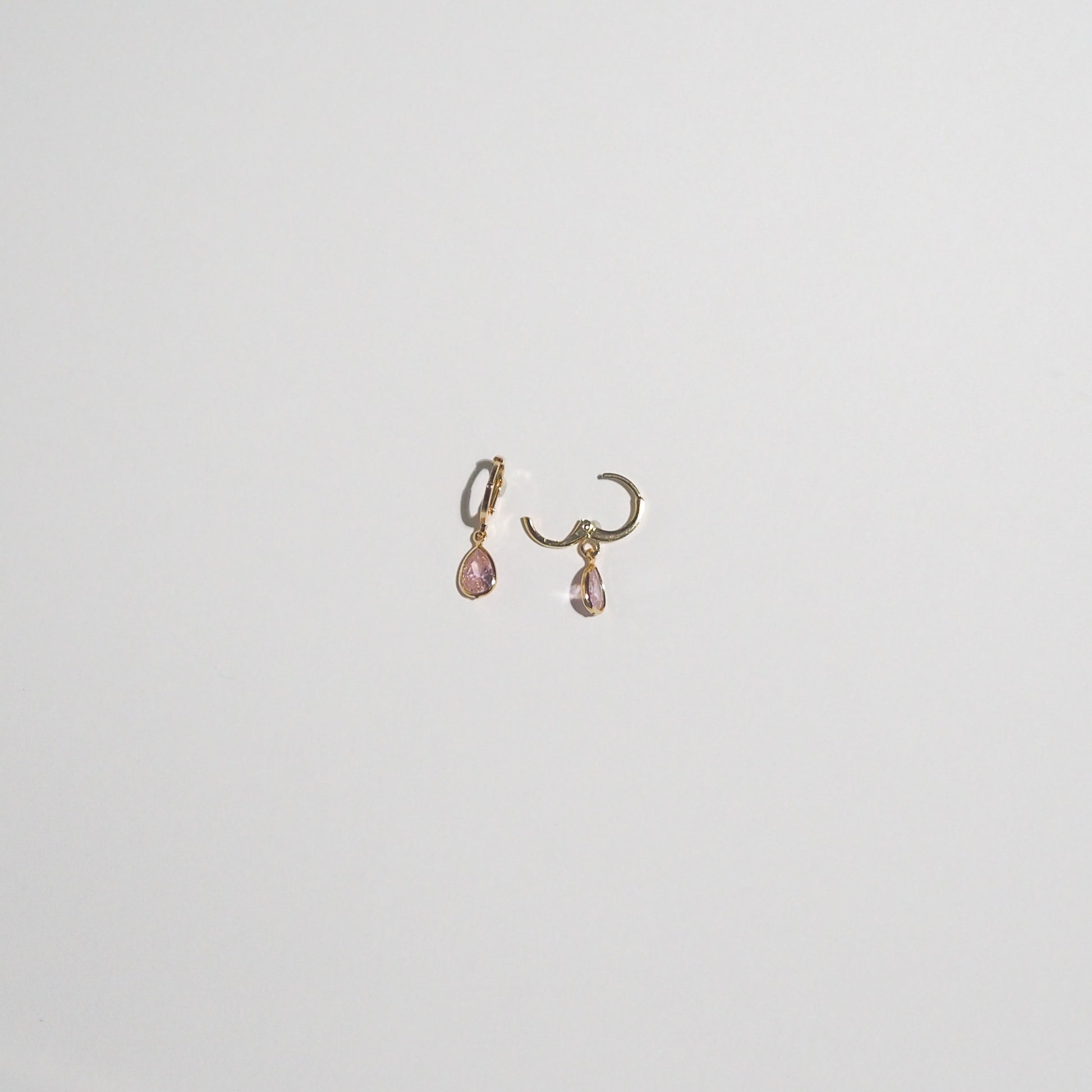 Rose is a 18k Gold Filled dangle huggie-style earring with a pink CZ teardrop shaped stone.