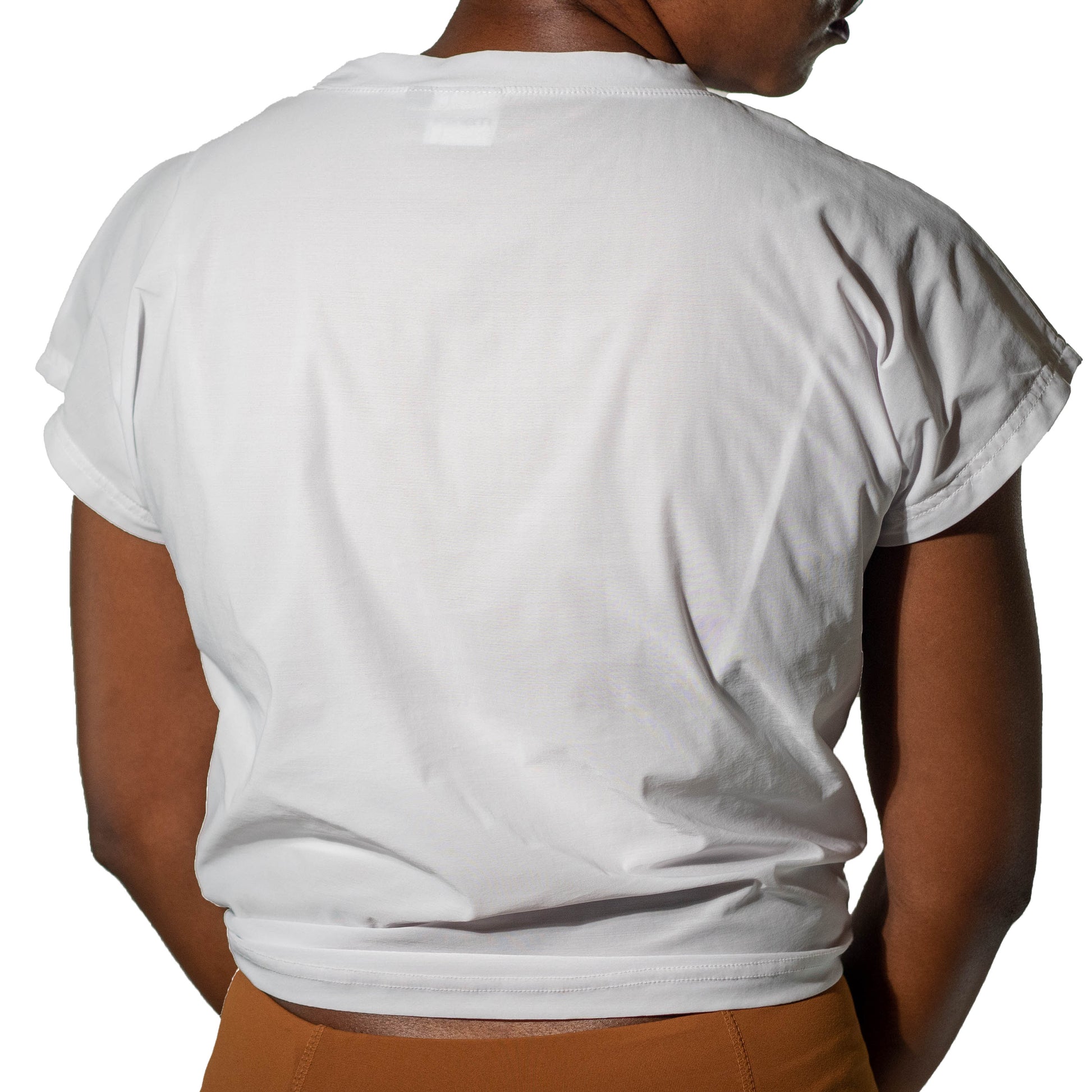 Let your skin breathe easier through your morning jog or coffee run in this eco-friendly white crop top. Savon has short sleeves and a front panel gathered around an o-ring.
