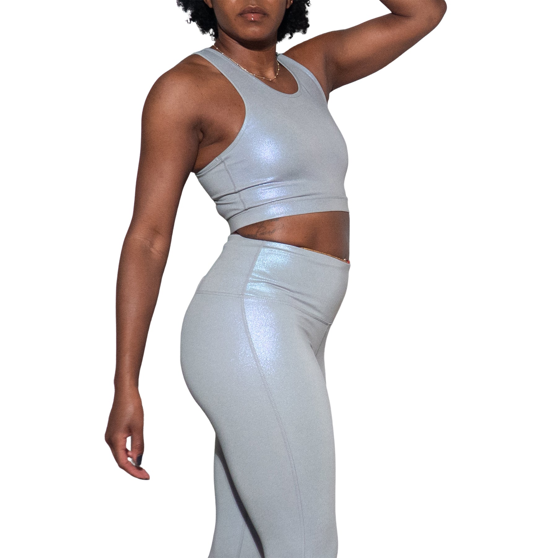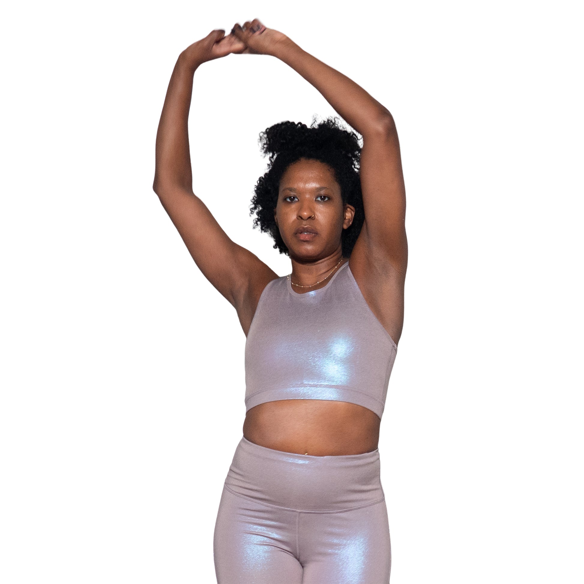 Wendell is a holographic sports bra with a racerback silhouette. It is made from a four-way stretch fabric to provide comfort and support. Comes with removable pads.